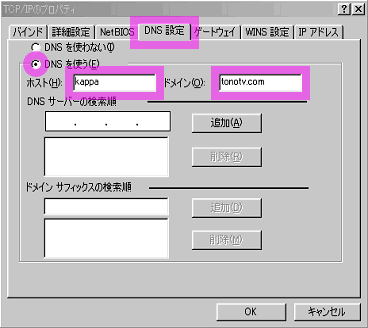 [DNS設定]タグをクリックして、[DNSを使う]をクリックしてください。 ユーザ情報通知書のメールのIDを[ホスト]に、tonotv.comを[ドメイン]に入力してください。
