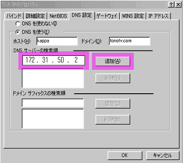 ユーザ情報通知書に書かれているDNSサーバ(プライマリ)の値を[DNSサーバーの検索順]に入力し、[追加]を押してください。