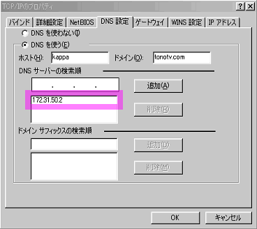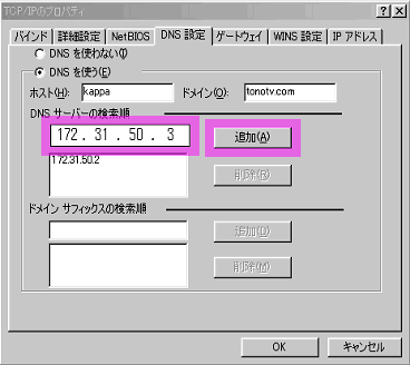 ユーザ情報通知書に書かれているDNSサーバ(セカンダリ)の値を[DNSサーバーの検索順]に入力し、[追加]を押してください。