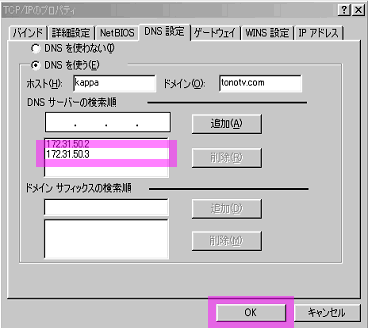 下のボックスにDNSサーバのアドレスが入っていることを確認してください。