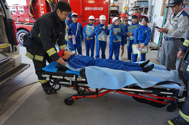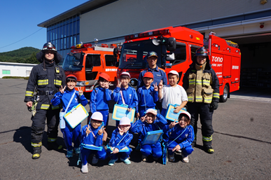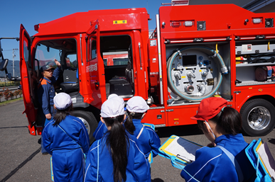 3年消防署見学 10月3日(金)に、3年生が社会科見学で遠野消防署に行ってきました。消防車や救急車の設備を見たり、実際にホースや酸素ボンベを持ったりしました。また、消防士の方が防火服に着替える場面では、あまりの速さに、子どもたちから大きな拍手がわきました。消防署が火事に備えて日頃から準備し、訓練していることを学びました。