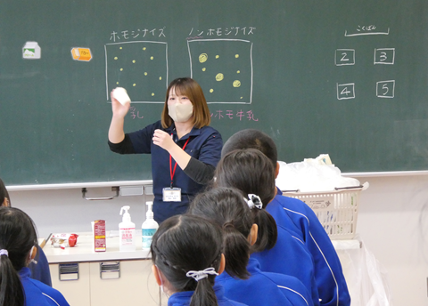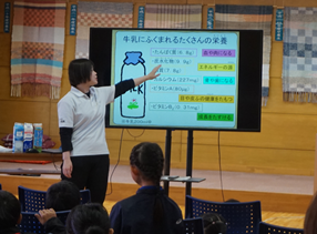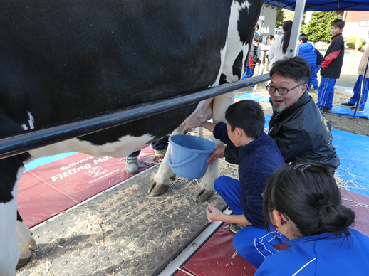 11月12日(水)に「酪農出前教室」が実施されました。これは、乳牛の体の仕組みや牛乳の栄養の話、バター作りや搾乳体験などを通して、自分たちが毎日飲んでいる牛乳や、酪農についての理解を図ることをねらいとしています。