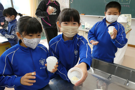 2~5年生で、2校時はJAの方から酪農や乳牛についてのお話を聞き、3種類の牛乳の飲み比べをしました。子どもたちはにおいを嗅いだり味を比べたりして、自分なりにテイスティングをしていました。3校時はバター作り体験を行いました。小岩井乳業の方から教えていただいたとおり、生クリームを入れたカップを一生懸命振りました。できたバターはクラッカーにつけて試食しましたが、自分で作ったバターの味に大満足の様子でした。4校時は1年生と6年生も加わり、牛との触れ合い搾乳体験です。母牛の大きさに驚き、はじめは恐る恐るの搾乳体験も、実際にお乳が出るととても嬉しそうでした。また、子牛も来ていて、そのかわいらしさにみんなにっこりでした。