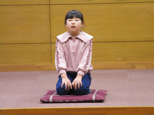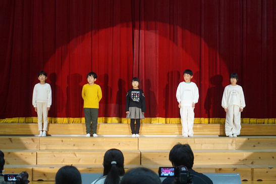 第2部は、1~3年生による劇「あるさるとカニの物語」でスタートです。有名な「さるカニ合戦」とはちょっと違ったお話で、一人一人がたくさんのセリフを覚え、一生懸命演じました。カニの子どもたちの多彩な技、臼やはぜ棒の必殺技など見所満載でした。次は、4・5年生による劇「まぬけ村物語」でした。戦に行きたくない村人たちは、役人の前で「まぬけのふり」をします。4・5年生全員が全力で「まぬけ」を演じ、会場の皆さんにたくさんの笑いを届けました。最後は6年生による劇「空へ飛び立つ日」でした。今年は戦後80年。当時の人々が戦争の中でどんなことを考え、どう生きていたのか、6年生8名が自分たちの思いを伝えるために一人何役も務め、役になりきって演じました。「閉会の言葉」の堂々とした6年生の姿も立派でした。