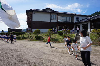 9月2日(火)に、土砂災害避難訓練と土砂災害出前授業を実施しました。本来であれば気象情報等をもとに早めに保護者の方に迎えに来ていただくのですが、今回は、急激かつ大量の降雨により学校での垂直避難を余儀なくされたという設定で行いました。綾織保育園の園児の皆さんも小学校に避難する合同訓練としました。