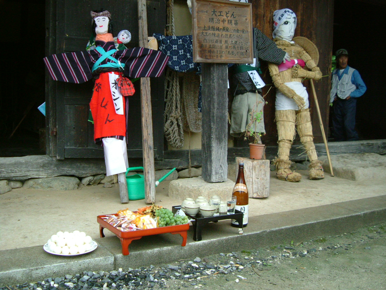 雨風祭りは、立春から数えて210日(9月初め頃)に行われる伝承行事です。 ちょうど中稲の開花期で、台風襲来の時期にあたるため、雨風の被害が無い事を祈願する行事です。 今年は9月4日に行われ、曇り空の中「雨風祭り」と墨描きした旗や男女わら人形を持ち村内を歩き回りました。 まぶりっとの案内の元、来村したお客様も一緒に人形や旗を持ちながら参加していました。 その後、稲荷神社にわら人形を奉納して今年の豊作祈願も一緒に行いました。