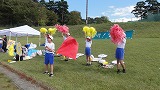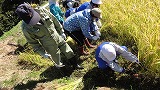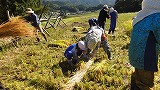 最初に稲の刈り取り方の説明を受け、実演してもらいました。子どもたちは、その実演のとおり片手に鎌を持ち、もう一方の手で稲株の根元をつかみ、刈り取る作業に熱中しました。刈り取る作業と同時に、稲を束ねる作業にも挑戦しました。その後は、稲を運び、はせ掛けも体験しました。前日の雨で田んぼには水もありましたが、そんなことを気にせず黙々と作業を進めていきました。子ども達は、作業にとても集中していたので、予定よりも早く全ての作業が終わりました。