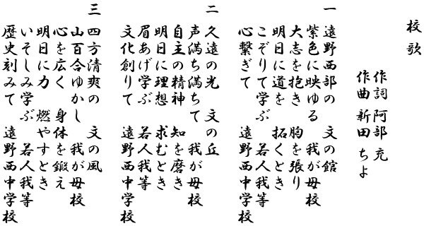 | 平成25年 | 遠野市立中学校再編成計画に基づき、小友中学校及び宮守中学校を閉校し、 遠野市立遠野西中学校を開校(生徒数 145名、職員数18名) |