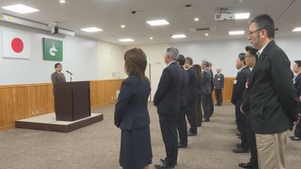 今週日曜日に投開票が行われた遠野市長選挙で、再選を果たした多田一彦市長がきょう市役所本庁舎に初登庁しました。市の職員から拍手で迎えられた多田市長は、引き締まった表情で2期目の登庁式に臨みました。式では初めに鈴木惣喜副市長が「多田市政2期目はグローバルな視点で遠野の未来を明るくする基盤作りの4年になると思います。私も補助者として、職員と一緒に市政課題の解決に向けスピード感を持ってチャレンジしていきます。」と、あいさつしました。続いて多田市長が市政運営の方針や今後の抱負を述べました。このあと多田市長は職員に「また4年間お願いします。一緒に明るく元気にチームワーク良くチャレンジをしていきましょう」と話し、2期目をスタートさせました。