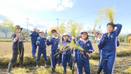 春に上郷小学校で田植えした苗が収穫時期を迎え、先週木曜日児童たちが稲刈りを体験しました。上郷小学校では総合的な学習の時間に米づくりを学んでおり、春には5・6年生の児童が菊池正則さん所有の田んぼに「ヒメノモチ」の苗を植えました。そしてこの日は待ちに待った稲刈り体験。児童たちは菊池さんから稲を刈るときの姿勢やカマの持ち方を教わると、さっそく稲刈りに挑戦しました。前日の雨で水分を含んだ田んぼは少し歩きにくそうでしたが、児童たちはその心配をよそにもくもくと手を動かしていきました。また児童の中には、一度に2・3束の稲を持ち、テンポよくリズミカルに刈り取る姿も見られました。刈り取りが終わった後は、稲穂を天日干しして乾燥させる「はせがけ」も体験しました。なお上郷小学校では、来月夢産直かみごうで収穫したもち米を販売する予定です。