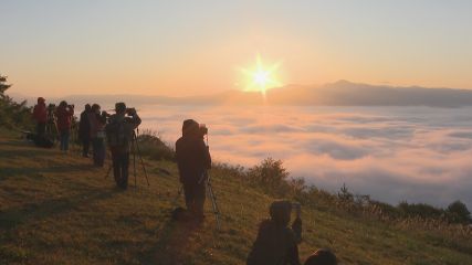 続いては秋の風物詩の話題です。市内では「雲海」が連日発生し、松崎町の高清水展望台では多くの人がこの時期ならではの絶景を楽しんでいます。先週金曜日、高清水展望台には辺りが真っ暗なうちから30人ほどが集まり雲海を眺めていました。波のようにうねる様子はまさに雲の海≠ナす。そして午前5時30分ごろ山頂から朝日が顔を出すと、集まった人たちはスマートフォンや一眼レフカメラで朝焼けに染まった雲海を撮影していました。沿岸の山田町から初めて訪れたというこちらの家族は。雲海は天候や気温などの条件がそろえば11月まで発生します。いつもより早起きして幻想的な自然の風景を楽しんでみてはいかがでしょうか。