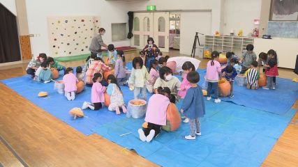 遠野聖光こども園でハロウィンにちなんだカボチャのランタン作りが先週金曜日に行われました。遠野聖光こども園では毎年この時期にハロウィン行事を開催していて、この日は午前中にカボチャを顔の形にくり抜いた「ジャック・オー・ランタン」作りが行われました。4歳・5歳クラスの園児たちはハロウィンの由来について話を聞いた後、大きなカボチャの中に手を入れて種とわたを取り出しました。続いてカボチャの表面に目や口の絵を描き、その線に添ってくり抜きました。園児たちは先生の力も借りながら一生懸命作業し、完成後はその出来ばえに満足した様子でした。また0歳から3歳の園児たちも真剣な表情でカボチャに絵や模様を描いていました。完成したランタンは力を合わせて外に運び出し、こども園の玄関や歩道沿いに並べられました。そして午後4時ごろランタンにろうそくの灯がともり、夕闇に様々な表情のジャック・オー・ランタンが浮かび上がっていました。なおランタンの点灯は今週10月31日金曜日まで行われる予定で、点灯時間は午後4時から6時ごろまでです。
