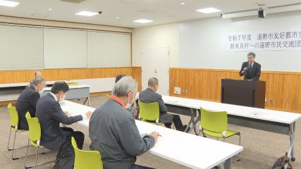 遠野市の友好都市である宮崎県西米良村に派遣される市民交流団の出発式が、今週の火曜日市役所本庁舎で行われました。市民交流団の派遣は、友好都市である熊本県菊池市と宮崎県西米良村の歴史や文化などに触れることで視野を広げ、遠野を見つめなおす機会にしようと、実施されています。また、令和4年度からは菊池市と西米良村へ隔年でそれぞれ訪問することになり、昨年度は、菊池市を訪問しました。そして今年度は、西米良村に市民6人が派遣されることになり、この日出発式が行われました。出発式では遠野市民交流団の小林立栄団長が、あいさつしました。続いて、派遣される市民それぞれが自己紹介をして交流事業への抱負を語りました。抱負を聞いた多田市長は「楽しさの中に有意義なツアーがあると思います楽しみながら交流を深めてきてください」と激励しました。なお市民交流団は、あす7日・金曜日に遠野を出発し2泊3日の日程で西米良村を訪問、「ゆず」の収穫体験や月明りの中で舞う「月の神楽」見学などを通して交流を深めるということです。