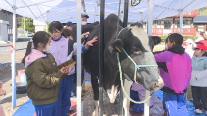 酪農について学ぶ体験型の出前授業が、先週水曜日に綾織小学校で行われました。出前授業には綾織小学校の2年生から5年生が参加し、酪農家の仕事や普段飲んでいる牛乳がどのように作られているのかを学びました。初めにJA全農いわての菊池真永さんがホルスタイン種の特徴について説明し、胃が4つもあることや体重が600キロ以上あることを伝えました。続いて県内で生産された3種類の牛乳を飲み比べて、星のマークがついた牛乳がどれなのかを当てるクイズが行われ、児童たちは匂いや味の違いをじっくり確かめていました。飲み比べのあとはバター作りを体験。クリームが入ったカップを10分ほど振ってバターを作り、クラッカーに塗って試食しました。そして出前授業の最後には校庭で牛とのふれあいが行われました。2頭の乳牛を連れてきたのは、上郷町の酪農家佐野茂樹さんです。ふれあい体験ではブラッシングや乳しぼりをしたほか、生後3カ月の子牛にミルクをあげたり聴診器で心臓の音を聞いたりしていました。綾織小学校の児童たちは様々な体験を通じて乳牛や酪農家の仕事、普段口にしている乳製品などについて理解を深めた様子でした。