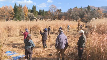 茅葺き文化への理解を深めてもらう「茅刈体験ワークショップ」が今週日曜日(16日)綾織町で開かれました。このワークショップは茅葺き文化への理解を深めてもらうとともに、重要文化財・旧千葉家住宅をはじめ、市内におよそ40棟ある茅葺き屋根の葺き替えに使う茅を確保しようと、重文千葉家の活用を考える会が開きました。この日は市内外からおよそ20人が参加しました。はじめに綾織地区センター前で重文千葉家の活用を考える会の照井文雄会長が茅刈りの目的などを説明したあと、綾織町下綾織の茅場に移動して作業を始めました。この日は好天に恵まれる中参加した人たちは茅を刈る班と刈り取った茅の葉を落とす班に分かれ、協力しながら生えそろった多くの茅を手際よく刈り取っていました。また刈った茅を束ねて干す「シマダテ」の設置も行われ、干された茅が秋の日差しを受け黄金色に輝いていました。この日刈り取った茅は来年春まで茅場の「シマダテ」で乾燥させたあと、遠野かやぶき保存協会に納入されるということです。