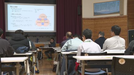 農作物の栽培技術や土づくりについて専門家から学ぶ「遠野起農塾」の講習会が今週水曜日土淵地区センターで開かれました。遠野市では化学肥料や農薬の使用を減らすなど環境にやさしい農業を推進するため、年間を通じて栽培技術を学ぶ講習会を開いています。この日は岐阜県で有機農業とオカラやモミガラなどを使った堆肥作りに取り組む五段農園の高谷裕一郎代表が講師を務め、土づくりと堆肥づくりをテーマに講習を行いました。はじめに「堆肥を活かした土づくり」と題して、高谷さんは物理性・生物性・科学性の観点から、良い土と堆肥ができる条件や、化学肥料を多用した場合の影響などを説明しました。また土を育てる主役は「微生物」であることに触れ、微生物が活動しやすい環境を整えることの重要性を強調しました。さらに良い堆肥づくりには「炭素・チッソ・微生物・ミネラル」の4つの要素の組み合わせが重要であることを紹介すると、参加した人たちは今後の参考にしようと熱心にメモを取り耳を傾けていました。またこの日は堆肥センターに場所を移して「地域資源を活用した堆肥づくり」と題したワークショップも行われました。参加した人たちは高谷さんにアドバイスを受けながら材料を混ぜ手で触ったり握ったりして柔らかさや水分量を確かめるなど、実践的に堆肥づくりを学んでいました。なお、今年度の遠野起農塾の講習会は今回で終了となり、来年2月には1年間の成果をまとめる報告会が予定されています。
