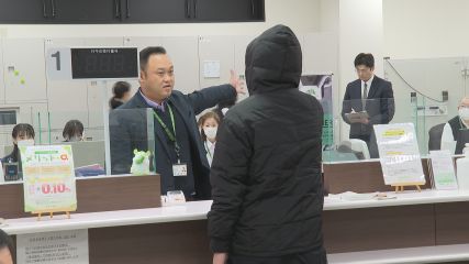 現金の取り扱いが増える年末年始を前に、先週の木曜日、岩手銀行遠野支店では、強盗対応訓練が行われました。強盗対応訓練は、多額のお金が動く年末年始を前に金融機関で万が一の状況に備えて防犯対策を強化しようと遠野地区金融機関防犯協会と遠野警察署が実施しました。この日は、刃物を持った犯人が行員を脅しながら現金を奪い、仲間の車で逃走するという想定で訓練が実施されました。行員は犯人を刺激しないよう要求された現金を渡しその後すぐに非常通報ボタンを押して警察に通報すると、駆けつけた警察官に逃走した強盗犯の特徴や行動、逃走経路などを詳しく説明していました。訓練後の講評では遠野警察署刑事・生活安全課の白金健志課長が犯人に対して刺激することなく落ち着いた良好な対応だったと話し、お金よりも、第一に職員とお客さんの身の安全を優先してほしいとアドバイスしていました。