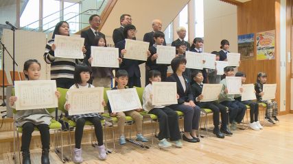 第24回「絵で伝えよう!わたしの町のたからもの」絵画展の表彰式が、今週日曜日本庁舎で行われました。この絵画展はふるさとの自然や文化歴史に目を向けその素晴らしさを発見し、郷土愛の心を育むことなどを目的に遠野ユネスコ協会が毎年開催しています。絵画展には市内の児童・生徒が描いた、いつまでも遠野に残しておきたい風景や文化などの作品185点が集まりました。この日行われた表彰式では、特に優れた作品22点に賞が贈られました。最高賞となる日本ユネスコ協会連盟会長賞には、綾織小学校3年の鈴木美悠さんの作品「夏のひまわり」が選ばれました。鈴木さんの作品は、上郷町のひまわり畑の中を走るJR釜石線の様子が色鮮やかに描かれていて、表現力の高さなどが評価され、今回の受賞となりました。児童・生徒たちは絵を描くことを通して自分が住むまちを見つめ直し魅力を再発見していた様子でした。