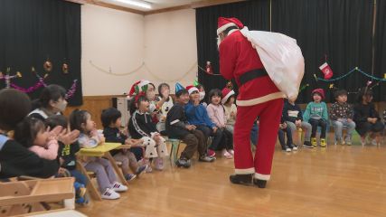 岩滝保育園できょうクリスマス会が開かれ、園児たちのもとに一足早くサンタクロースがやってきました。岩滝保育園では、毎年この時期にクリスマス会を開いていて、ことしは21人の園児が参加し歌や踊りなどでクリスマスの雰囲気を盛り上げました。会がにぎやかに進んでいくと鈴が鳴り響き、サンタクロースとトナカイが登場。うれしいサプライズに大きな歓声が上がり、ホールは子どもたちの笑顔であふれました。そして園児たちはサンタさんから一人ひとりプレゼントを受け取り、にこやかな表情を見せていました。カット切り替わるまで待ちますまた園児たちはサンタさんへ「あわてんぼうのサンタクロース」の歌をプレゼントしました。最後にみんなで記念撮影を行い、子どもたちは笑顔いっぱいで楽しいクリスマス会のひとときを過ごしていました。