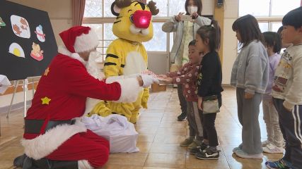 市内の保育園ではクリスマスを前にサンタクロースならぬ反射クロース≠ェ登場し、園児に冬を安全に過ごすための約束ごとを伝えています。この取り組みは本格的な冬を迎える中、凍結した路面でのケガや交通事故にあわないように、遠野市交通指導隊が毎年この時期に行っています。このうち先週木曜日は宮守保育園に反射クロースとトラきちくんが登場し、3歳から5歳の園児に屋根の下で遊んだり道路に飛び出したりすると危ないことをわかりやすく教えていました。また反射クロースはポケットに手を入れて歩くと転んだ時に危ないことや雪や氷柱を口に入れないといったことも伝え、最後は反射材のキーホルダーとパズルをプレゼントしていました。宮守保育園の園児たちは反射クロ―スから教わったことを守り、冬の間安全に過ごすことを誓っていました。
