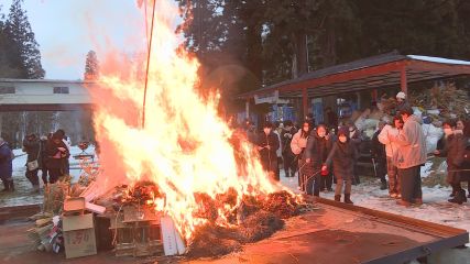 遠野郷八幡宮できのう小正月行事の年越祭とどんと祭が開催され、市内外から多くの人が参加しました。年越祭は遠野郷八幡宮の神様の年取りとされ、普段は本殿の奥に安置されているゴンゲンサマを年に1度、1月15日にあそばせる行事です。拝殿では神事が執り行われたあと、八幡神楽がゴンゲン舞を奉納しました。舞っている途中にゴンゲンサマの口から赤い布が出される所作は、火を吹き消す様子を表しています。続いて参列者たちがゴンゲンサマに頭を噛んでもらい、ことし1年を健やかに過ごせるように祈っていました。また年越祭のあとはしめ縄・門松・古いお札などを焚きあげ、年神さまを送るどんと祭が行われました。参加者は勢いよく燃え上がる炎で身を清め、振舞われた餅をあぶって食べることで無病息災を祈っていました。