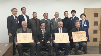 去年12月に開かれたいわて農林水産躍進大会で表彰を受けた団体の代表者が先週金曜日、多田市長に受賞を報告しました。この日とぴあ庁舎を訪れたのは、表彰を受けた上郷町の「かみごう農産」土淵町の「土淵町農村活性化協議会」そして附馬牛町の「遠野森のがっこう」の代表者や関係者など9人です。いわて農林水産躍進大会での表彰は、農林水産物の産地づくりや活力ある地域づくりなどに努めた団体や個人を称えるもので、市内から3つの団体と施設が受賞しました。カットが変わるまで待ちます「かみごう農産」は、上郷地区の農業を担う組織として農地の借り受けや農作業の共同化などを通し市内の営農組合の模範となっていることなどが評価され『活力とうるおいにあふれた「むらづくり」賞』を受賞しました。また「土淵町農村活性化協議会」は地域住民による市民農園の共同管理などを通して遊休農地の解消と交流の場の創出などが評価され、「いわて中山間賞」を受賞しました。そして「遠野森のがっこう」は、梁に伝統的な仕口を施す木工技術の継承とプレカット加工の採用で、工業化と手仕事のバランスが取れている点が評価され、「いわて木材利用優良施設等優秀賞」を受賞しました。報告を受けた多田市長は「このように評価されるということは、日ごろの活動の成果だと思う」と表彰を受けた団体を称えていました。