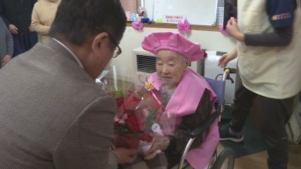 きょう1月29日に100歳の誕生日を迎えた松崎町の女性に、遠野市から花束や記念品が贈られました。100歳の節目を迎えた畑山ミツさん。大正15年生まれの畑山さんは17歳で結婚し、家業である農業を手伝いながら5人の子どもを育てあげました。2年半前から穀町のグループホームかなえに入居しており、ストーブにあたりながらテレビを見たり他の入居者と一緒に元気に歌を歌ったりしながら過ごしているそうです。きょう午前11時から行われたセレモニーには畑山さんの家族や入居者、グループホームのスタッフが参加し、和やかな雰囲気の中で100歳を祝いました。セレモニーの最後には多田市長から「おめでとうございます。人生を楽しみながら長生きしてください」という言葉と共に、花束と記念品のたんすが贈られました。畑山さんは、「ありがとうございます」と、笑顔で受け取っていました。百寿を迎えた今も食事は自力でとり、残さず食べるという畑山さん。これからも元気に過ごして長生きしてください。