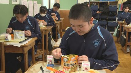 「全国学校給食週間」にあわせて今週火曜日、市内の小中学校の給食に学校給食用の非常食「救給カレー」が提供されました。毎年1月24日から30日までの1週間は「全国学校給食週間」と定められていて、学校給食の意義や役割について理解を深めてもらおうと全国で様々な行事が行われています。市内では今週火曜日、小中学校の給食に学校給食用の非常食「救給カレー」が提供されました。このカレーは東日本大震災の発生直後、被災地ではライフラインの停止や食料不足などによって給食の提供ができなくなったことから、全国の栄養教諭や学校栄養職員が開発しました。容器の中はカレーと一緒にごはんが混ぜ込まれていて、温めずにそのまま食べることもできます。また賞味期限は製造から3年半で、食品アレルギーに配慮して作られています。この日取材した遠野西中学校の3年生は温められた救給カレーを手順に沿って開封し、おいしそうに食べていました。生徒たちは救給カレーをきっかけに、災害への備えについて思いをめぐらせた様子でした。
