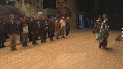 今月21日に公演初日を迎える「市民の舞台遠野物語ファンタジー」の舞台安全祈願祭が先週金曜日市民センター大ホールで行われました。この日は遠野物語ファンタジー制作委員やキャスト、スタッフなどおよそ30人が集まりました。はじめに舞台上で神事が執り行われ、舞台関係者が公演の安全と成功を願い一人ひとり玉串を捧げました。51回目の公演となる遠野物語ファンタジー「異聞極楽を見てきた婆様」は第14回公演の「極楽を見てきた婆様」をリメイクした作品で、高齢者の生きがいや幸せとは何かを深く掘り下げた内容となっています。公演は今月21日土曜日と22日日曜日の2日間市民センター大ホールで合わせて2回行われます。チケットは市民センターやとぴあ、遠野風の丘、各地区センターなどで販売しています。問い合わせは遠野物語ファンタジー制作委員会事務局電話62−6191までお願いします。