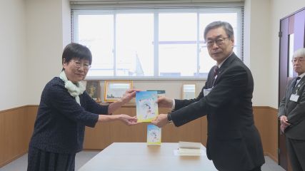 岩手児童文学の会が先週木曜日、岩手を舞台にした物語の作品集を市内の各小学校に寄附しました。市役所とぴあ庁舎を訪れたのは、岩手児童文学の会の佐々木喜久子さんと中村祥子さんの2人です。寄附採納式では佐々木さんから鈴木副市長に、今回寄附される岩手児童文学の会の50周年記念短編作品集「物語のゆりかご岩手のこみち」が手渡されました。今回の寄附は執筆者のひとりでもある佐々木さんが遠野出身だったことや、児童文学の未来を担ってほしいという思いから実施され、市内11の小学校に1冊ずつ送られました。こちらの本には岩手を舞台とした15編の短い物語が収められていて、時代を超えて伝えたい思いや願いが込められているそうです。鈴木副市長は「岩手県内を舞台にした作品集ということで子どもたちも身近に感じると思いますし、郷土愛の醸成にもつながると思います」と、感謝していました。なお「物語のゆりかご岩手のこみち」は、内田書店で購入できるということです。