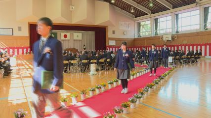 3月に入り卒業式のシーズンとなりました。きのうは遠野高校と緑峰高校で卒業式が行われ、卒業生たちは新たな進路に向けて学び舎を旅立ちました。遠野高校の卒業式では卒業生81人が保護者と在校生に迎えられて入場しました。式では担任から名前を呼ばれた卒業生が、ひとりずつ松田隆宏校長から卒業証書を受け取りました。このあと松田校長が、「これからは未来を自らの手で切り拓いていくことが一層求められる。学び続けること夢や目標を持ち続けることを意識してほしい」とはなむけの言葉を送りました。続いて在校生を代表して山口まりやさんから、「私たちは先輩方の姿から仲間と協力し課題解決に向けて毎日進むことの大切さを学びました。」とこれまでの感謝を込めた送辞がありました。続いて、卒業生を代表して田中奏多さんが3年間の高校生活を振り返り卒業の喜びと未来への決意を話しました。81人の卒業生たちは、それぞれの夢や目標に向かって、3年間仲間と切磋琢磨し慣れ親しんだ学び舎をあとにしました。なお2月末現在卒業生の進路は進学が51人、就職が24人となっています。また、きのうは緑峰高校でも卒業式が行われ、生産技術科30人情報処理科7人の計37人が晴れやかな表情で体育館に入場しました。式では初めに三浦幸哉校長が、ホップ和紙で作られた卒業証書を1人1人に手渡しました。全員に卒業証書を手渡した三浦校長は式辞で、「変化の激しい時代であり、人生の中で苦難や試練もあると思いますが、当校の卒業生であることに誇りを持ち、力強く歩んでください。」と、はなむけの言葉を送っていました。続いて在校生代表の堀切悠生さんが、「先輩方は私たちの良き手本でした。そのひたむきな姿勢を在校生も見習い、緑峰高校の伝統をさらに発展していけるよう精進します」と、送辞を述べました。このあと卒業生を代表し佐藤美結さんが答辞を述べ、3年間をふり返りながら同級生や先生、家族への感謝を語りました。なお緑峰高校の卒業生は就職が27人進学が10人と全員の進路が決まっており、それぞれが新たな道に向かい思い出の詰まった学び舎を巣立っていきました。