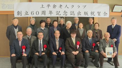 上平倉老人クラブ創立60周年記念誌の出版を祝う祝賀会が、きのう上郷町の平野原公民館で開催されました。上平倉老人クラブは去年7月から創立60周年記念誌「私たちの歩みその後の10年」の制作に取り組んでいて先月ついに完成しました。こちらの記念誌には地域の環境整備活動やスポーツの大会、研修旅行に参加したときの写真や記事など、創立51年目となる平成26年からの10年間を中心に活動の記録が載っています。きのう開かれた出版を祝う祝賀会には現在所属している30人のクラブ員のうち15人が参加し、初めに上平倉老人クラブの宮澤一禎会長があいさつしました。続いて来賓の多田市長が、「この度は記念誌の出版おめでとうございます。私が若い頃から指導いただいている皆さんが元気でいられることが何よりです。」と、祝辞を述べました。このあとクラブ員たちは食事やジュースを味わいながら交流し、親睦を深めました。上平倉老人クラブのクラブ員たちはこれからも仲間と共に、楽しく活動を続けていこうと結束を固めた様子でした。