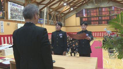 遠野東中学校できょう卒業式が行われました。今年度、遠野東中学校では46人が門出の日を迎え、卒業生たちは家族や在校生が見守るなか少し緊張したような表情で体育館に入場しました。初めに卒業証書授与が行われ、担任に名前を呼ばれた卒業生が上舘敦彦校長から卒業証書を受け取りました。卒業証書を手渡した上舘校長は式辞で、「予測不能といわれる時代の中ですが、これまでの経験を糧に自分の人生を切り開いてください」と話し、卒業後の挑戦や成長に期待を寄せていました。このあと在校生を代表して千葉空さんが、「体育祭や中総体、文化祭などで引っ張ってくださった卒業生の皆さん、東中学校の伝統と温かな校風は私たちが受け継ぎます。」と、送辞を述べました。続いて卒業生代表の西村旬平さんが答辞を述べ、3年間ともに過ごした同級生への思いと今後に向けた決意を語りました。卒業生たちは仲間や先生との別れを惜しみながら中学校生活最後の合唱を歌い上げ、それぞれの道に向かい新たな一歩を踏み出しました。
