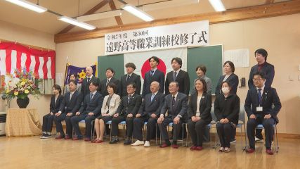青笹町の遠野高等職業訓練校で先週金曜日に修了式が行われました。この日、修了式を迎えたのは木造建築科で3年間の訓練課程を終えた藤田陽人さんと佐々木孝弥さんです。2人は市内の事業所に勤めながら、年間50日、遠野高等職業訓練校で木造建築に必要な技能や知識を身に付けてきました。修了式では照井文雄校長から2人に修了証書が手渡されました。また、式では佐々木さんに岩手職業能力開発協会長表彰、藤田さんには遠野高等職業訓練校長表彰がそれぞれ贈られました。このあと、照井校長が「ここで学んだ基礎を土台としてこれからも自ら進んで技術の向上に取り組んでください」とはなむけの言葉を送りました。続けて、修了生2人が答辞を述べ訓練校で学んだ日々を振り返りながら感謝の思いを語りました。なお2人は今後、訓練校で身につけた技術や知識を生かしながら、さらに腕を磨いていくということです。