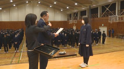 令和8年度サイバーセキュリティモデル校に選ばれた遠野高校で、指定書の交付式が今週火曜日に行われました。サイバーセキュリティモデル校は、生徒たちがサイバー犯罪やSNS等を通じた性的被害などに巻き込まれないようにするため、管内の中学校・高校の中から指定されます。交付式では遠野警察署の佐藤武彦署長から、遠野高校生徒会副会長の新田茉穂さんに指定書が手渡されました。続いて遠野警察署の刑事・生活安全課生活安全係長の飛澤大輔さんが、インターネットやSNSなどを利用した犯罪、巧妙に相手をだます手口について講話を行いました。生徒たちは実際に中学生や高校生が加害者・被害者となった事例を聞きながら、不正アクセス、闇バイト、生成AIの悪用といった犯罪から自分を守るための知識を身に付けていました。なお、サイバーセキュリティモデル校の指定期間は、来年3月31日までの1年間です。