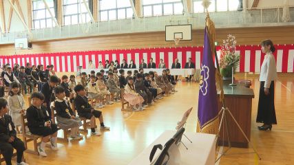 きょう遠野北小学校では市内の小学校で最も多い35人の新入生を向かい入れ入学式が行われました。遠野北小学校の入学式では、新入生が保護者や在校生からあたたかい拍手が送られる中、少し緊張した表情で入場しました。遠野北小学校の新入生は35人で、市内11の小学校で最も多い人数となっています。式では初めに新入生が、担任の先生に名前を呼ばれると、元気に返事をしていました。続いて菊池ゆかり校長が「入学を認めます」と答えたあと式辞を述べました。また入学のお祝いとしてPTAからタブレット端末のケースや、登下校時の安全を支える黄色い帽子が贈られました。式の最後には入学式を見守った在校生を代表して児童会長の菊池里紗さんが歓迎の言葉を贈ったあと、校歌が披露されました。遠野北小学校は新入生35人を加えた193人で新年度のスタートを切り、5月には運動会が予定されています。
