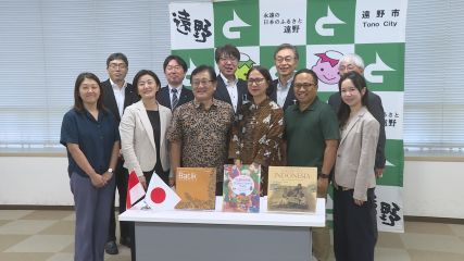 駐日インドネシア大使館の職員が先週金曜日に多田市長を表敬訪問しました。市役所とぴあ庁舎を訪れたのは駐日インドネシア大使館の職員3人とコーディネーター2人です。遠野市はおととし9月にインドネシア共和国プルバリンガ市と「友好連携の構築に関する意向表明」を締結し、人材開発・産業・教育など様々な分野における友好連携の構築を図っています。大使館のギナ・アングライニさんは、「私たちは遠野市とプルバリンガ市のように地方と地方が交流し関係性が深まっていくことを重要視しています」と、あいさつしました。続いて行われた寄附採納式では、駐日インドネシア大使館からこども本の森遠野や市立図書館に向けてインドネシア語で書かれた本30冊が寄贈されました。受け取った多田市長は「いただいた本は多くのこどもたちがインドネシアを知るきっかけになると思います」と、感謝していました。また懇談の中でギナさんたちは「先日はプルバリンガ市で遠野をテーマにした中学生作文コンクールが行われた」「ぜひ遠野の皆さんにもプルバリンガ市に来てほしい」などと話していました。このほか大使館の職員たちは滞在中に技能実習生が働いているワイ・デー・ケーや筑波ダイカスト工業を訪問し、先週末に開催された遠野まつりにも参加しました。なお遠野市は外国人技能実習生制度の活用をはじめ、プルバリンガ市との友好連携や交流をより一層進めていくとしています。