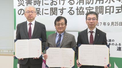 災害時に円滑に消防用水を確保するため、きのう遠野市と市内のコンクリートミキサー車を保有する2つの事業所が協定を締結しました。きのうの協定調印式には多田市長と遠野レミコンの住吉谷雅弘取締役副社長、宮守生コンの新田光志代表取締役が出席しました。この協定は市内事業所が所有するコンクリートミキサー車に水を積載し、火災が発生した際に消火用の水を確保し迅速な消火活動につなげることを目的としています。この協定によって山間部など消防用水の確保が難しい場所などにおいて、水不足が考えられる場合に、2つの事業所は市からの要請に応じてコンクリートミキサー車での水運搬を実施します。コンクリートミキサー車1台あたり、およそ4トンの水を運ぶことが可能で、円滑な消火活動を支援することができます。協定を締結した後遠野レミコンの住吉谷代表取締役と宮守生コンの新田代表取締役がそれぞれあいさつしました。なおコンクリートミキサー車を活用した消防用水の確保については、ことし3月に発生した大船渡市林野火災においても実際に活用されていて、協定の締結は県内では遠野市が7例目ということです。
