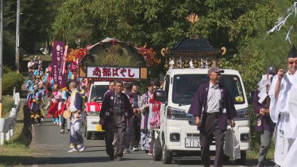宮守町にある砥森神社の例大祭が先週土曜日から2日間執り行われました。宮守町下宮守に鎮座する砥森神社は、延暦年間に坂上田村麻呂が砥森山山頂に戦勝祈願で祠を建てたのが始まりと言われており、9月27日、28日を祭日としています。先週土曜日は、砥森神社で神事が行われたあと、神輿が鹿込神楽、新町南部ばやし、下郷さんさ踊り、和太鼓和を従えて宮守町内を巡る神輿渡御が行われました。神輿は、宮守総合支所やみやもり荘などを練り歩き、地域の安泰や無病息災などを祈願しました。また宮守町の新町通りに住む人たちで郷土芸能の歴史を継承している新町南部ばやしは、ことしも地域の子どもたちが艶やかな姿で舞を奉納していました。沿道集まった地域住民は、町内を巡幸する神輿や郷土芸能に見入り、宮守の秋を彩るまつりを堪能していました。