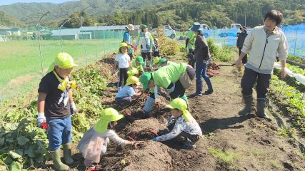 秋晴れとなったきょう、附馬牛保育園の園児が春に植えたサツマイモを収穫しました。県道160号の附馬牛大橋付近にある農地では、園児の食育推進と遊休農地解消に向けたPR活動の一環として去年からサツマイモが植えられています。参加した附馬牛保育園4・5歳クラスの園児たちは農地利用最適化推進委員や農業委員から教わりながら、春に植えたサツマイモ紅はるかと紅あずまを収穫しました。園児たちはサツマイモを折らないように土を優しく掘り、中から大きなイモが出てくると、歓声をあげてよろこんでいました。また収穫したサツマイモの一部は保育園の近所にあるふれあいホーム附馬牛や附馬牛地区センターにおすそ分けされました。なお附馬牛保育園では園児たちが収穫したサツマイモを2週間ほど干して甘くしたあと、焼き芋にしてみんなで食べると話していました。