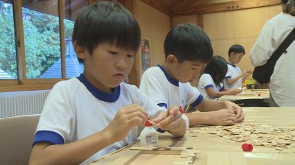 とおの里山美林推進事業の工場見学と木工教室が、きのう青笹町の遠野木材流通センターなどを会場に開催されました。とおの里山美林推進事業は、今後の地域を担う子どもたちに森林をもっと身近に感じてもらおうと、遠野市が「いわての森林づくり県民税」を活用して取り組んでいます。きのうは、遠野北小学校の3年生24人が遠野木工団地を訪れ、森林から切り出された木材が加工され製品となる一連の流れを学びました。はじめに児童たちは、遠野木材流通センターで市内の山から集められた丸太を間近に見学しました。原料となる木を見学した後、ノッチ・アート遠野に移動し、学校の机やいすがどのように作られているのか学習しました。職員からは、机やいすにはナラ・アカマツ・カラマツの3種類の木材が使われていることやどのように組立られているのかの説明を受けました。児童たちは「組み立てるときになぜ釘を使わないのか」「なぜナラの木を使うのか」と熱心に質問するなど、木や環境について興味を持った様子でした。見学の後は遠野市森林総合センターに移動し、木製のフォトフレームづくりに挑戦しました。児童たちはスギやクリ、サクラ・ケヤキなどおよそ8種類の木材チップをボンドで貼り付け、自分好みにアレンジしながらフォトフレームを作り上げていました。木目や色がひとつひとつ違う木材に触れた児童たちは自然の恵みと木のぬくもりを感じていた様子でした。