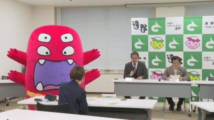 遠野市記者懇談会がきょう開かれ、4つの項目と主要行事が発表されました。この中ではこちら!イカイモンについても発表されています。きょうの記者懇談会では、はじめに観光PRキャラクター「イカイもん」着ぐるみ完成についてが報告され、イカイもんが登場しました。この「イカイもん」は、遠野物語を広く知ってもらい遠野市の観光振興につなげようと去年10月にキャラクターデザインの原案を募集したところ、遠野市出身で東京都在住の鈴木晋仁さんの作品が最優秀賞を受賞し採用となりました。イカイもんは、遠野に息づく異界の世界観にちなんだ「異界の者」であり、異界へつながる「門」の存在であることから名前が付けられました。デザインの特徴は、漢字の「異」の文字と鳥居がモチーフとなっています。イカイもんは今後、来年1月の新年交賀会やはたちのつどい、JR釜石線新車両のお出迎えなどに登場するということです。続いて、遠野市緊急銃猟対応マニュアルの策定について報告されました。クマによる被害や目撃情報が全国的に問題となっている昨今、国が創設した緊急銃猟の運用にあたり、安全確保措置を十分に講じる必要があることから、市は、迅速かつ適切に対応できるように、市対応マニュアルを策定しました。実施にあたっては市職員と遠野警察署、遠野市鳥獣被害対策実施隊などの捕獲者が連携して取り組むとしています。運用開始は来年1月1日からを予定しています。なお市では、クマを早期に確認し対策展開につなげるため迅速な目撃情報の提供をお願いしています。連絡先は市農林課電話62−2111または遠野警察署電話62−0110までお願いします。このほか高校生台湾派遣事業の実施についてや令和7年度中高生海外派遣交流事業の取り組みが発表されました。