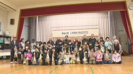 年の瀬が迫るなか、正月に飾るしめ縄を作る教室がきのう青笹地区センターで開かれました。この教室は世代間の交流を図りながら伝統文化を次の世代に伝えていこうと青笹町老人クラブ連合会が毎年開いています。きのうは青笹児童館を利用する児童32人が参加し、はじめに青笹町老人クラブ連合会の藤原稔会長が「お正月に皆さんの家の玄関に飾れるよう、頑張ってすばらしいしめ縄を作りましょう」とあいさつしました。このあと子どもたちは2人から3人のグループに分かれ、老人クラブの会員の手ほどきを受けながら稲わらを使ったしめ縄作りに挑戦しました。児童たちは慣れない作業に苦戦しながらも、老人クラブの会員に手を添えてもらいながら縄を編み上げると充実した表情を見せていました。参加した子どもたちは、地域の人たちと力を合わせて作ったしめ縄を飾って新しい年を迎えるのを楽しみにしている様子でした。