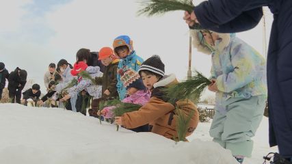 あおざさ子育て村の小正月行事が先週金曜日に青笹保育園で行われました。あおざさ子育て村では地域で受け継がれてきた小正月の伝統行事を子どもたちに伝えようと、青笹町老人クラブ連合会の協力を得てみずき飾りやお田植え、からす呼ばりを毎年行っています。この日は青笹保育園に通う園児や青笹児童館を利用する児童およそ50人が参加し、最初は食紅を使って、赤・緑・白・黄色の団子を1つ1つこねました。団子が完成したあとは青笹町老人クラブ連合会の藤原稔会長が小正月行事を行う理由について、「年末年始に忙しかった女性たちをねぎらい、1年間の豊作を願う意味が込められている」と、説明しました。続いて外へ移動し、稲に見立てた松の葉を雪で出来た田んぼに植えるお田植えや、「かーらす、からす、餅けっからこーいこい」と、歌ってあずき餅を投げるからす呼ばりが行われました。最後は高さ4メートルほどのみずきに、子どもたちが色とりどりの団子を飾り付け、五穀豊穣を祈っていました。なお、青笹保育園ではみずきを今週16日・金曜日まで飾るということです。