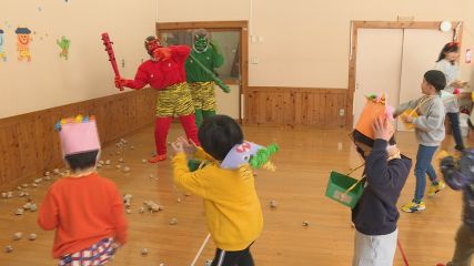 節分を迎えたきょう、市内各地の保育園では豆まき会が開かれました。このうち小友町の岩滝保育園で行われた豆まき会には、手作りの鬼の面を付けた3歳から5歳の園児が参加しました。園児たちはそれぞれの心の中にいる「おこりんぼう鬼」や「わがまま鬼」といった退治したい鬼を発表しました。このあと金棒を持った赤鬼と緑鬼が登場すると、園児たちは「おにはそと、ふくはうち!」と元気に叫びながら、鬼へ向かって豆に見たてたボールを投げました。豆を投げられた赤鬼は「みんなと一緒に踊りたかっただけ」「人を見た目だけで判断してはいけない」と話し、童謡「鬼のパンツ」の曲に合わせてみんなで一緒に踊り仲直りしました。豆まき会の最後は仲良くなった赤鬼・緑鬼が、心の中にいる悪い鬼を預かり鬼たちが暮らす山へ連れ帰っていきました。岩滝保育園の園児たちは再び鬼たちがやってくる来年の節分まで、心の中の悪い鬼に負けずいい子で過ごすことを誓っていました。