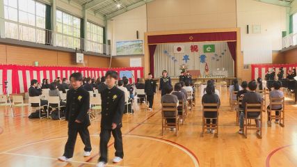 続いては宮守小学校の卒業式の様子をご覧ください。会場となった宮守小学校の体育館では大きな拍手が送られる中、卒業生14人が来月から通う遠野西中学校の制服姿で堂々と入場しました。初めに卒業証書授与が行われ、菊池和恵校長から卒業証書を受け取った卒業生が「ありがとうございます」と、感謝を伝えていました。卒業証書を手渡した菊池校長は「来月から中学生になる皆さん、勇気を持って新しいことに挑戦しさらに輝いて活躍していくことを願っています。」と、式辞を述べました。このあと卒業生が門出の言葉の中で、6年間の思い出を振り返りながら、これまで育ててくれた親やお世話になった先生、地域の人たちに感謝の言葉を送りました。在校生たちは「今までありがとうございました。これからはリーダーとして6年生の皆さんが築いてきた伝統をしっかりと受け継ぎます。」と、決意を新たにしていました。卒業生たちは宮守小学校で過ごしたかけがえのない日々を胸に、新たな一歩を踏み出しました。
